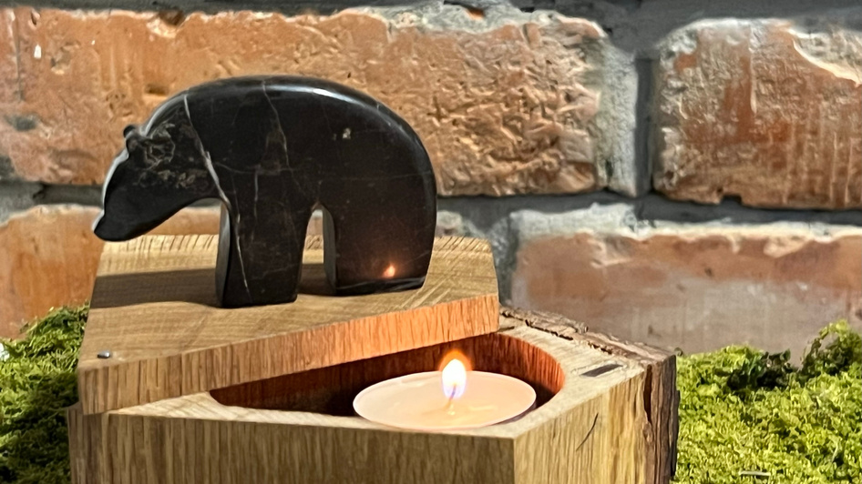 Rjavi medved, ta naš veličasten največji predstavnik zveri, je tesno povezan z identiteto destinacije Kočevsko. Kamen iz katerega je izdelan predstavlja destinacijo skozi svoj izvor, pa tudi simbolno, saj gre za navaden kamen, ki ga v gozdu najdemo v sivi barvi, z obdelavo pa zasije v temnejših rjavo sivih odtenkih in se v barvi približa barvi medveda. Kamen predstavlja trdnost in tradicijo destinacije, kjer življenje zaradi naravnih danosti od nekdaj ni lahko, vendar pa so prebivalci s svojo iznajdljivostjo in delavnostjo uspeli razviti in ohraniti bogato kulturno identiteto. Brlog izdelujemo iz različnih vrst lesa, ki jih najdemo v našem gozdu. Hrast in bukev poleg bivališča medveda, ki ga nudita s svojim gozdom ponujata tudi pomemben vir hrane predvsem v jesenskih mesecih.